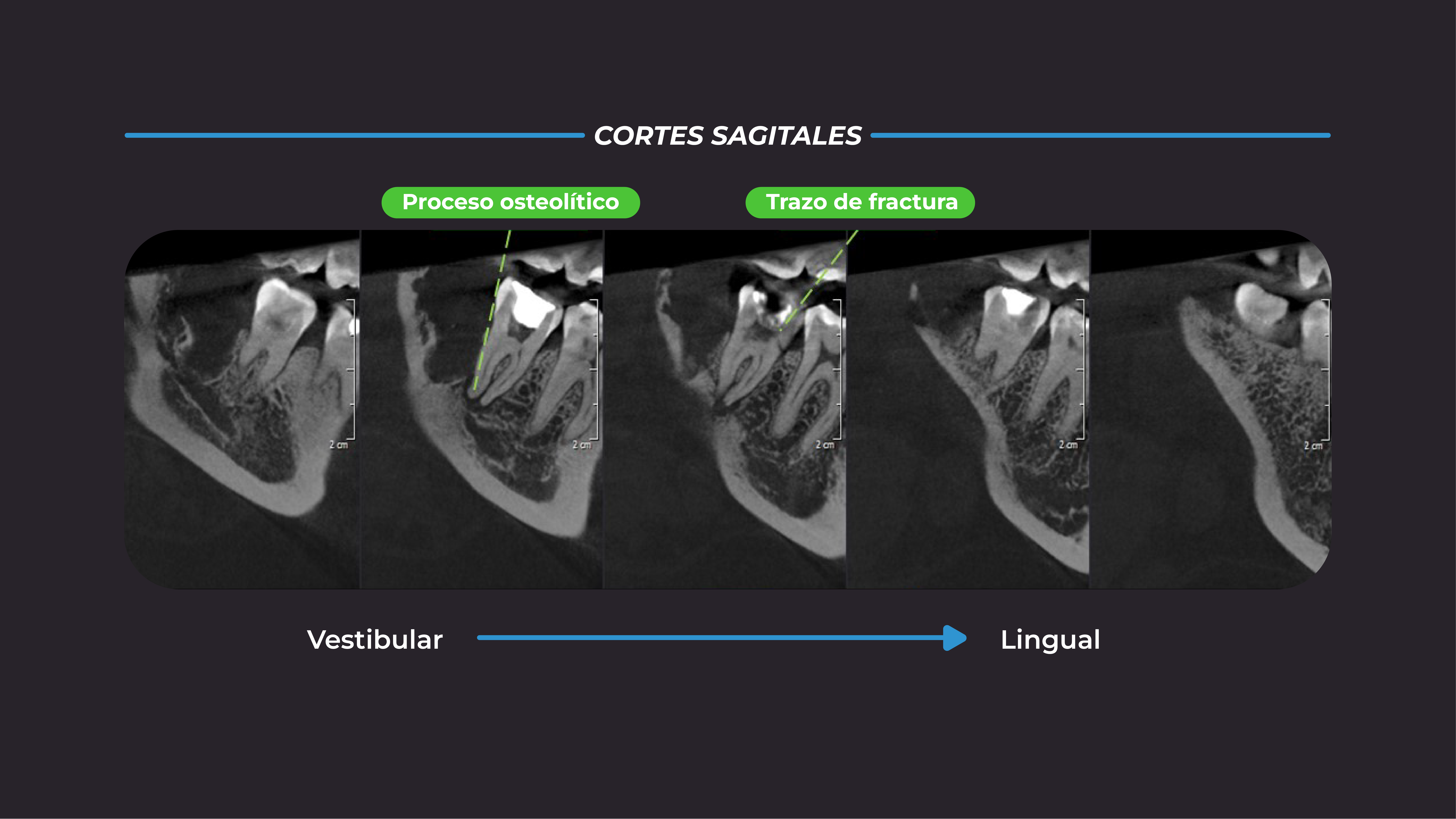En las vistas sagitales, de vestibular a lingual, se observa confirma la presencia del trazo de fractura, así como del proceso osteolítico periapical de pieza 4.7 (Figura 3).