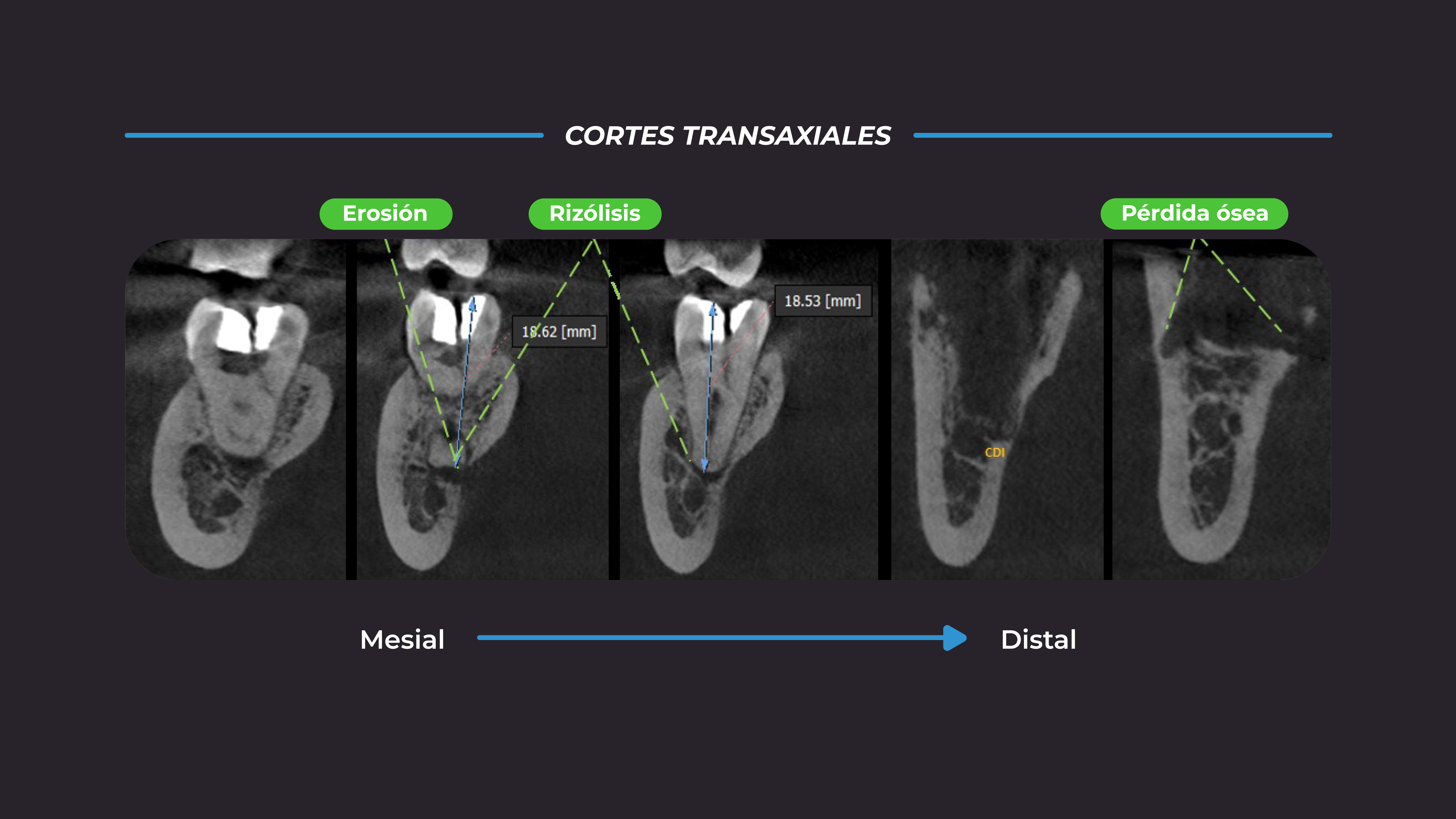En las vistas transaxiales, de mesial a distal, se observa adicionalmente que el proceso osteolítico periapical ocasiona rizólisis apical, así como erosión parcial de tabla ósea lingual, signos sugerentes de absceso apical crónico. Además, se evidencia que el lecho óseo quirúrgico de pieza 4.8 está localizado sobre conducto dentario inferior, con pérdida parcial de estructura ósea vestibular y lingual (Figura 4).