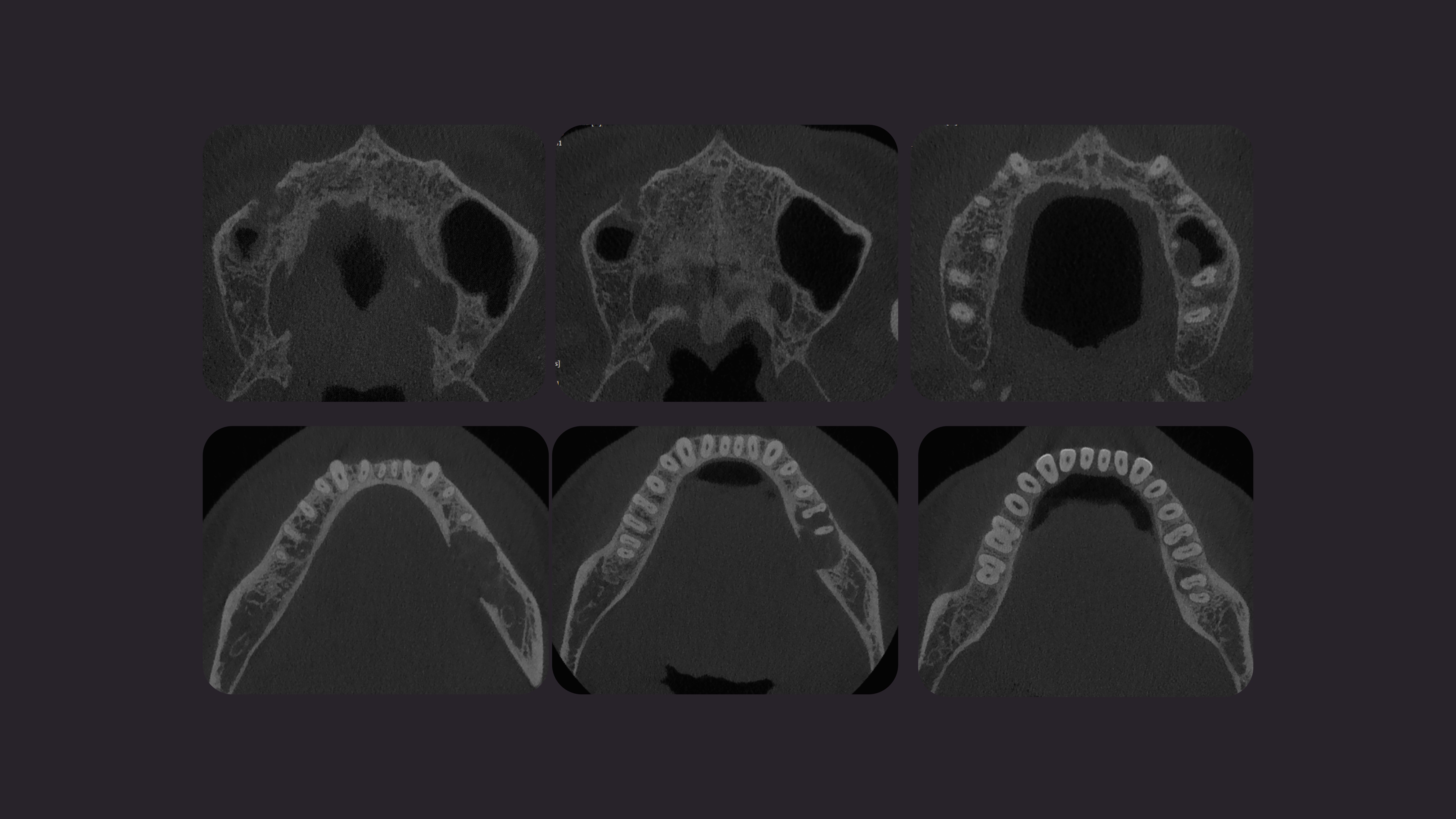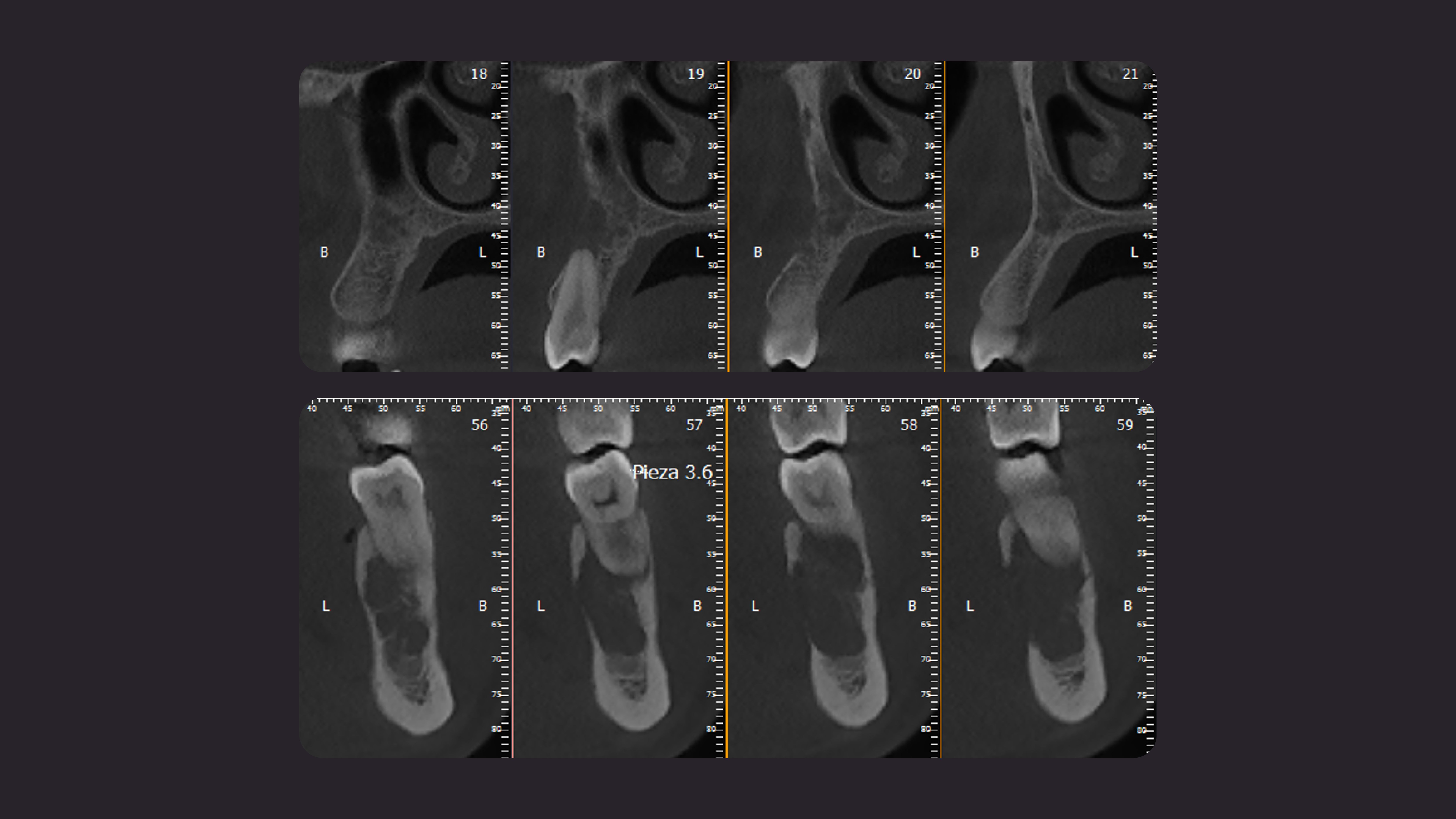 Fig.3: En los cortes axiales se observa el compromiso en ambos maxilares en zona de piezas especificas 1.5 y 3.6, 3.7. Además alteración en las trabéculas óseas.